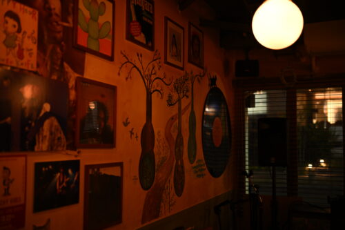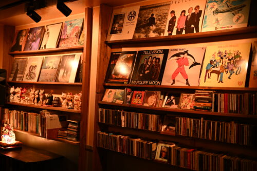 ’70年代音楽好きには堪らないしつらえの店内と壁のレコード群。